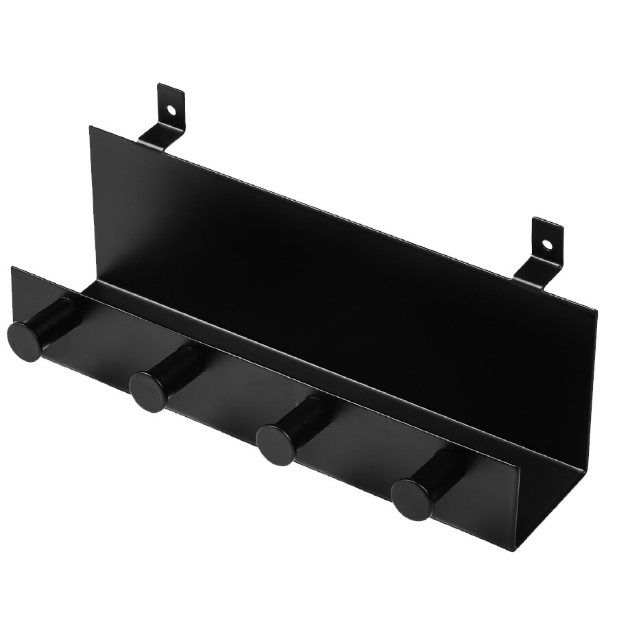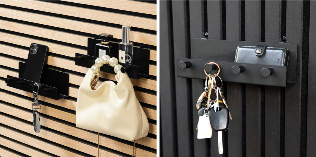 Multifunkční elegantní police v matně černé barvě, ideální pro vnesení pořádku do interiéru. Je navržena pro snadnou instalaci do mezer lamel akustických panelů. Je vybavena zvýšenou přední hranou proti pádu předmětů a čtyřmi zabudovanými háčky, které zajistí stálé místo pro klíče, deštníky či kabelky. Ušetřete čas a dodejte místnosti moderní styl.